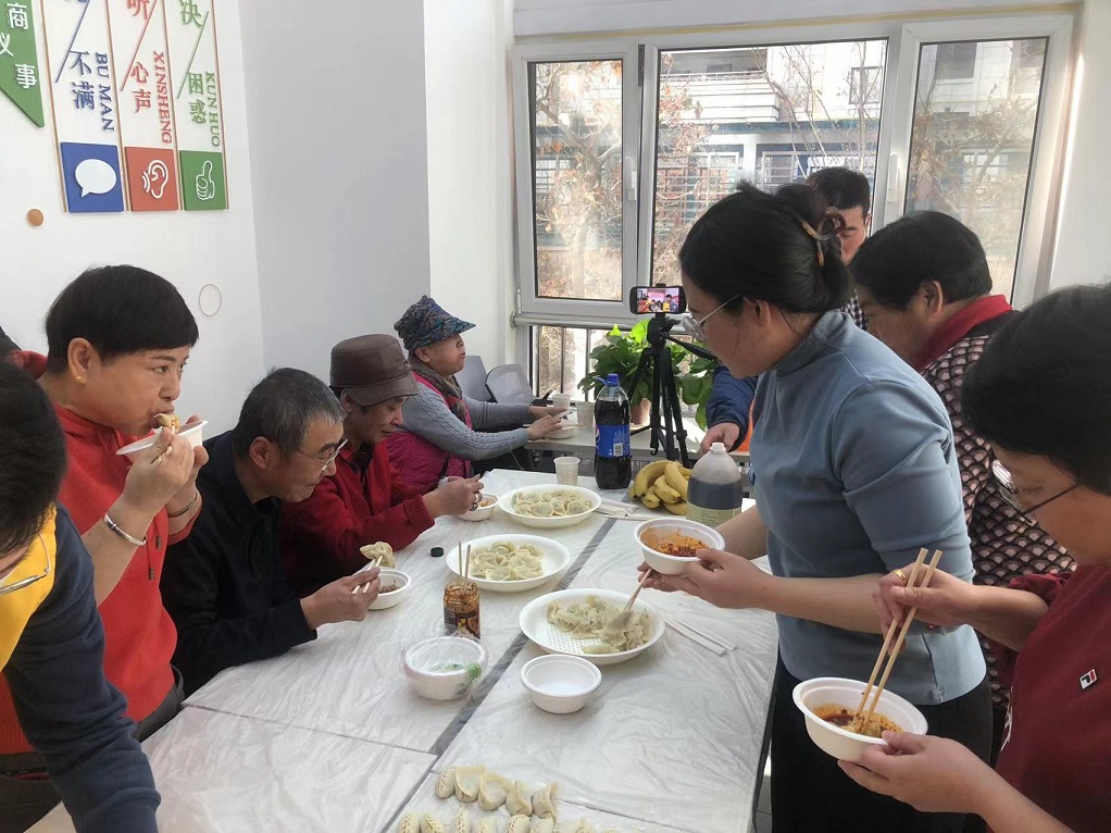 运动中,,11名住民群众、社区事情职员和集团公司自愿者们一起切菜剁馅,,一起包饺子、煮饺子,,忙得不亦乐乎。。当热腾腾的饺子端上桌,,各人围桌而坐,,共享香馥馥的饺子,,感受着浓重的节日气氛。。