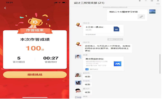 以赛促学,,,,,强技砺能精研细琢。。。。。各党支部组织党员通过学习强国“党的二十大精神答题运动”“党的二十大精神应知应会百题”等形式,,,,,开展线上答题竞赛,,,,,周全磨练党员干部对党的二十大报告内容的掌握水平,,,,,进一步增强党员干部对学习党的二十大精神的熟悉和重视,,,,,推动党的二十大精神入脑入心,,,,,牢靠提升学习效果,,,,,以赛促学、以知促行,,,,,用党的二十大精神武装头脑、指导实践、推动事情。。。。。