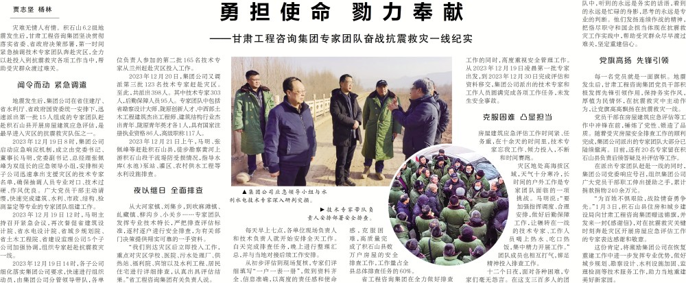 1月15日,,《甘肃日报》第4版刊载《勇担使命 勠力贡献——甘肃yl6776永利集团集团专家团队奋战抗震救灾一线纪实》。。。。。该报道周全反由钏集团公司党委心系灾区、闻令而动的一系列继续作为务执行动,,深度展现了专家团队和干部职工向险而行、甘于贡献的抗震救灾生动实践,,进一步凝聚起奋力争取抗震救灾周全胜利的强鼎实力。。。。。