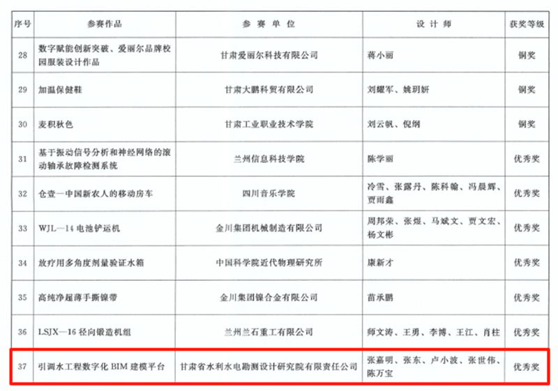 在甘肃省第七届BIM手艺应用大赛中, ,,,修建设计院、水电设计院报送的项目共斩获12项奖励, ,,,包办了设计组16个奖项中的10项。 。在甘肃省第五届“立异杯”工业设计大赛中, ,,,水电设计院《引调水工程数字化BIM建模平台》项目获优异奖。 。在第十七届全省职工优异手艺立异效果奖中, ,,,水电设计院、土木匠程院申报的两个项目分获立异效果奖三等奖, ,,,其中, ,,,《弃渣场三维设计平台》项目是全省水利系统唯一获奖效果。 。