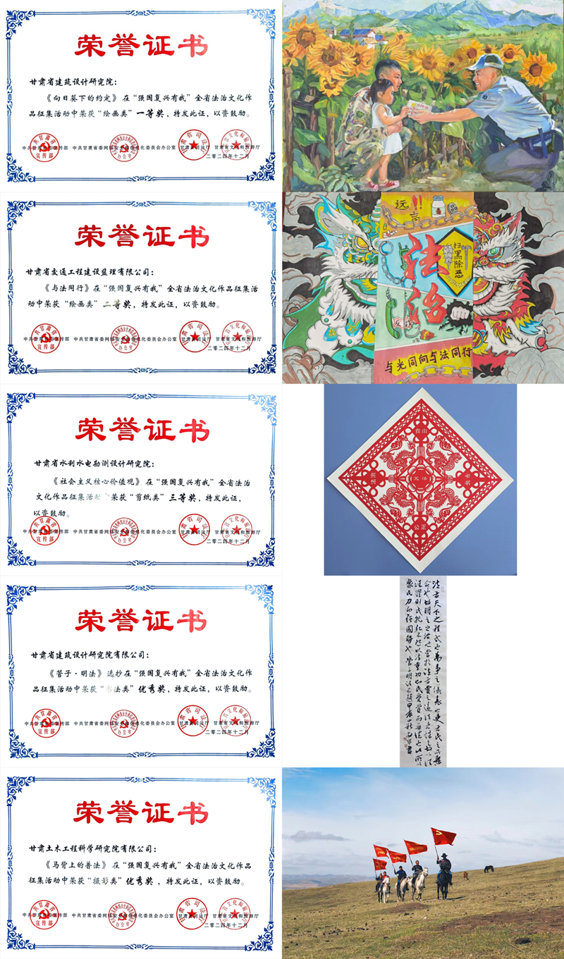 经评选,,,,,集团多件作品脱颖而出。。省修建设计院的《向日葵下的约定》以细腻笔触和奇异视角,,,,,获绘画类一等奖;;;;;省交通监理公司的《与法偕行》生动展现法治守护,,,,,获绘画类二等奖;;;;;省水电设计院的《社会主义焦点价值观》以精湛剪纸武艺,,,,,获剪纸类三等奖;;;;;省修建设计院的《〈管子·明法〉选抄》获书法类优异奖;;;;;甘肃土木匠程院的《马背上的普法》获摄影类优异奖。。