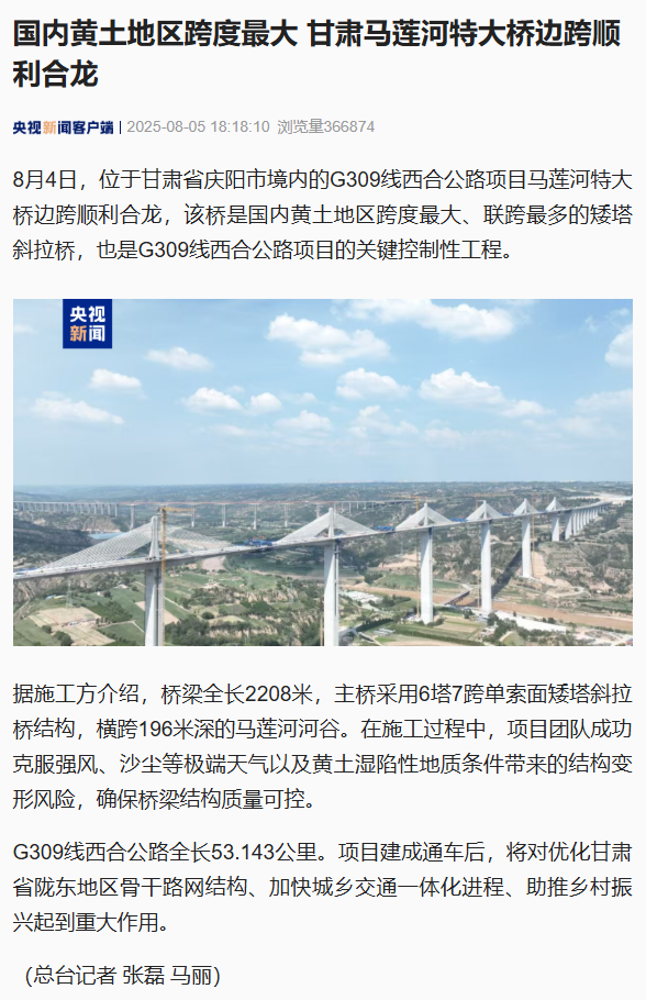 克日,,,,由甘肃yl6776永利集团集团旗下省交通监理公司承监的G309线西合公路项目建设取得重大希望——马莲河特大桥边跨顺遂合龙。。。。项目建成后,,,,将进一步完善区域路网结构,,,,对增进庆阳地区经济社会生长具有主要意义。。。。
