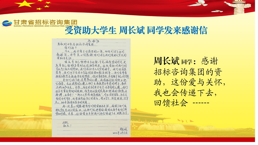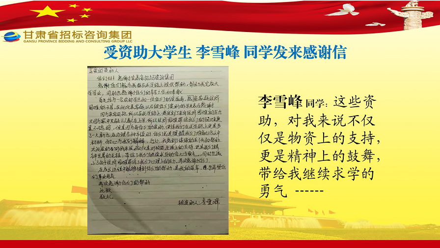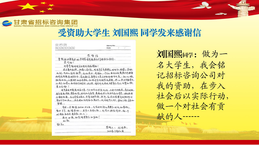 克日,,,张家川县张棉驿乡张棉村贫困大学生代表刘国熙、周长斌、李雪峰等向甘肃省招标咨询集团有限责任公司发来谢谢信,,,就招标咨询集团给予学费资助一事表达他们的谢谢之情。。