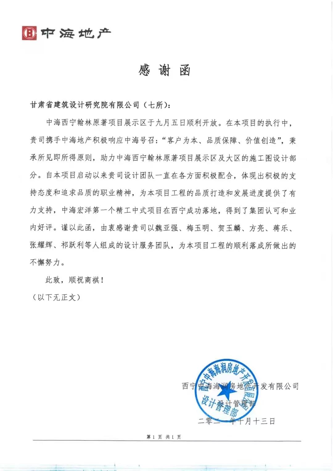 日前,,,,,修建设计院收到来自西宁中海地产的一封谢谢信,,,,,赞扬设计七所魏亚强、梅玉明、贺玉麟、方亮、蒋乐、张耀辉、祁跃利组成的设计团队在中海西宁翰林原著项目展示区及大区施工设计中的突出体现。。。。