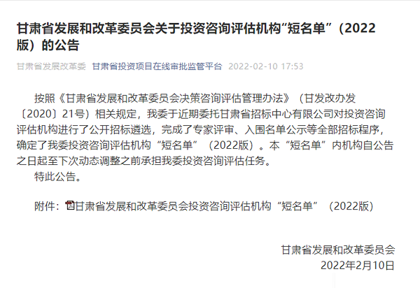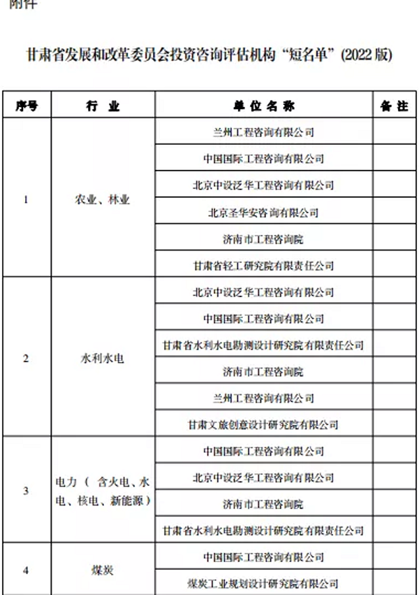 克日,,,,,省发改委宣布2022年进入省发改委投资咨询评估机构企业名单,,,,,甘肃省水利水电勘探设计研究院有限责任公司乐成入围三个行业板块。。。。。