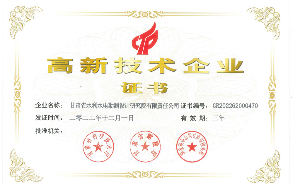 ÈÕǰ£¬£¬£¬¸ÊËàʡˮÀûË®µç¿±Ì½Éè¼ÆÑо¿ÔºÓÐÏÞÔðÈι«Ë¾»ñµÃ¸ÊËàÊ¡¿Æ¼¼Ìü¡¢¸ÊËàÊ¡²ÆÎñÌü¡¢¹ú¼Ò˰Îñ×ָܾÊËàʡ˰Îñ¾ÖÁªºÏ½ÒÏþµÄ¡°¸ßÐÂÊÖÒÕÆóÒµÖ¤Ê顱£¨Ö¤Êé±àºÅ£ºGR202262000470£©£¬£¬£¬±ê¼Ç×ÅË®µçÉè¼ÆÔºÕýʽÂõÈë¹ú¼Ò¸ßÐÂÊÖÒÕÆóÒµÐÐÁУ¬£¬£¬ÊÇÆóÒµÉú³¤µÄÓÖÒ»¸öÖ÷ÒªÀï³Ì±®¡£¡£¡£