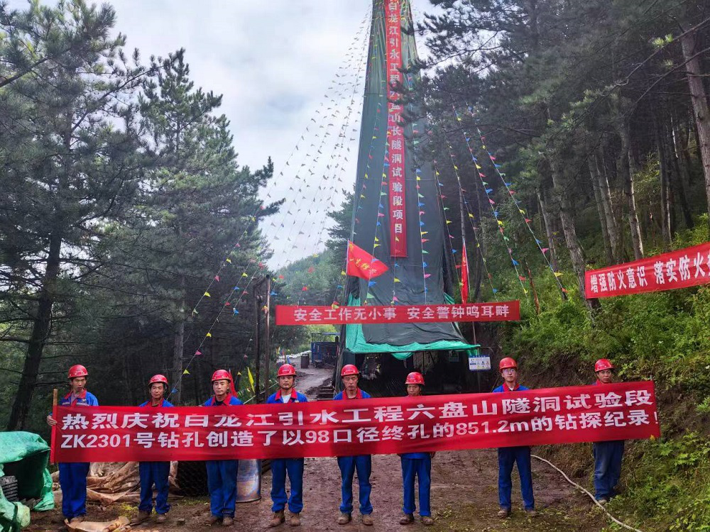 克日,,,,,省水电设计院勘探公司在白龙江引水工程六盘山长隧洞试验段项目ZK2301钻孔施工中,,,,,以98mm口径顺遂完成851.2m钻进使命,,,,,刷新了水电设计院在该口径终孔钻探原575m后最深纪录,,,,,极大地提振了干部职工的雄心壮志。。。。