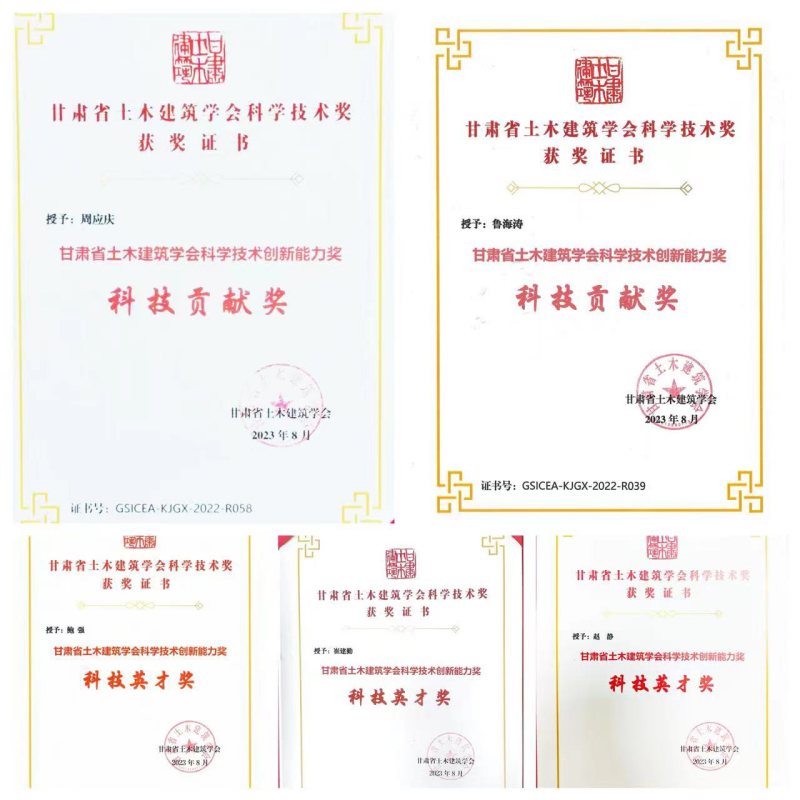 克日,,,土木匠程院荣获甘肃省土木修建学会科技立异奖,,,两人获得甘肃省土木修建学会科技孝顺奖,,,三人获得甘肃省土木修建学会科技英才奖。。。。。奖项的获得,,,充分展现了土木匠程院的专业手艺水平和科研能力。。。。。