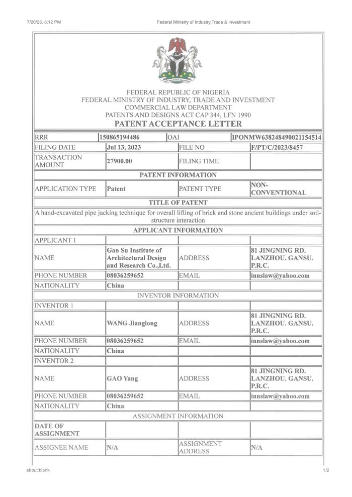ÈÕǰ£¬£¬£¬£¬£¬·ÇÃË֪ʶ²úȨ¾Ö¶ÔÊ¡ÐÞ½¨Éè¼ÆÔºÍõ½ÁúµÈÉ걨µÄ¡°ÍÁ£½á¹¹Ï໥×÷ÓÃÏÂשʯ½á¹¹¹ÅÐÞ½¨ÕûÌå¶¥ÉýÊÖ¾òʽ¶¥¹ÜÊÖÒÕ¡±£¨A hand-excavated pipe jacking technique for overall lifting of brick and stone ancient buildings under soil-structure interaction£©¾ÙÐÐÊÚȨ£¬£¬£¬£¬£¬ÎªÊ¡ÐÞ½¨Éè¼ÆÔººóÐø³Ð½ÓÔ®ÍâÏîÄ¿¼°ÍâÑóÏîÄ¿¸øÓèÁ˼áʵµÄÊÖÒÕÖ§³Ö¡£¡£¡£