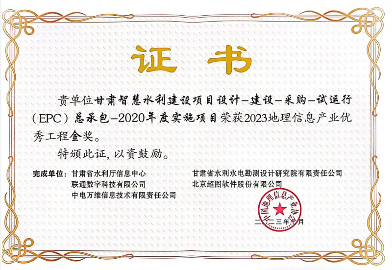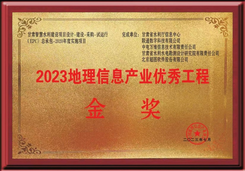 克日,,,第一届中国测绘地理信息大会在浙江召开。。。。由省水利厅实验、省水电设计院加入完成的“甘肃智慧水利建设项目设计-建设-采购-试运行(EPC)总承包-2020年度实验项目”荣获2023中国地理信息工业优异工程金奖。。。。