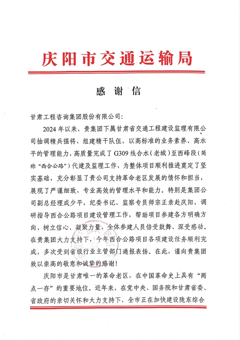 12月30日,,,甘肃yl6776永利集团集团收到庆阳市交通运输局的谢谢信,,,向省交通监理公司在G309线合水(老城)至西峰段公路项目建设历程中作出的孝顺体现谢谢。。。。。